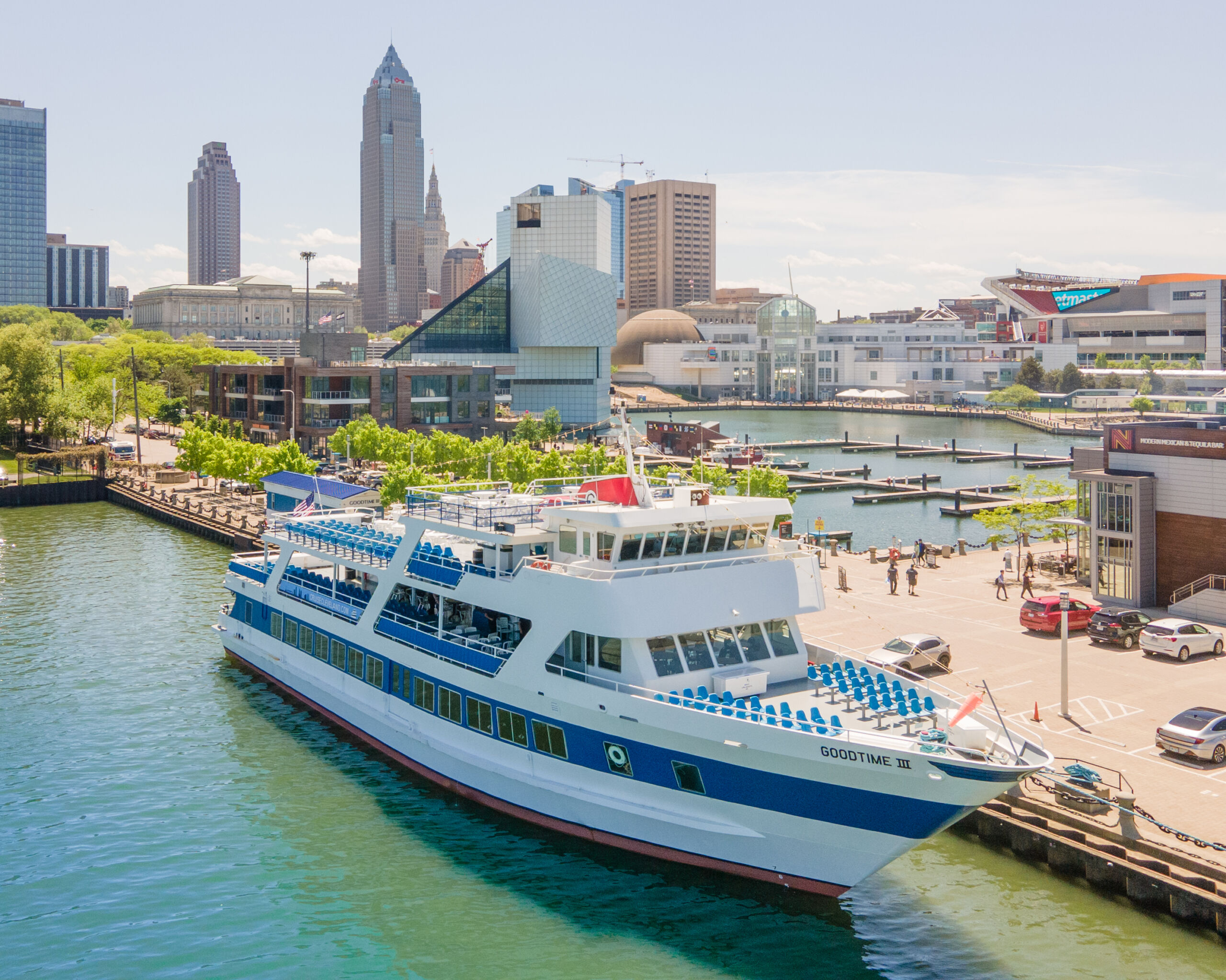 The GOODTIME III operates from Cleveland’s North Coast Inner Harbor at E. 9th Street Pier, behind the Rock and Roll Hall of Fame, the Great Lakes Science Center, and numerous Cleveland hotels are nearby.